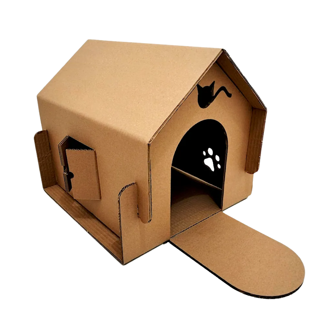 Casinha feita de papelão reciclado, perfeita para proporcionar conforto e diversão ao seu gato, com responsabilidade ambiental.