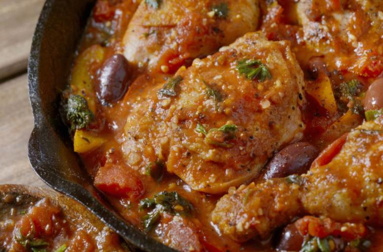 Xinxim de galinha: galinha refogada com azeite de dendê com castanha de caju e camarão, com origem africano