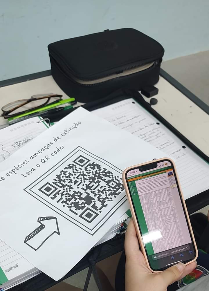 um QR code, e acessaram uma lista de espécies ameaçadas de extinção. Ainda durante a aula, foi feita uma analogia sobre