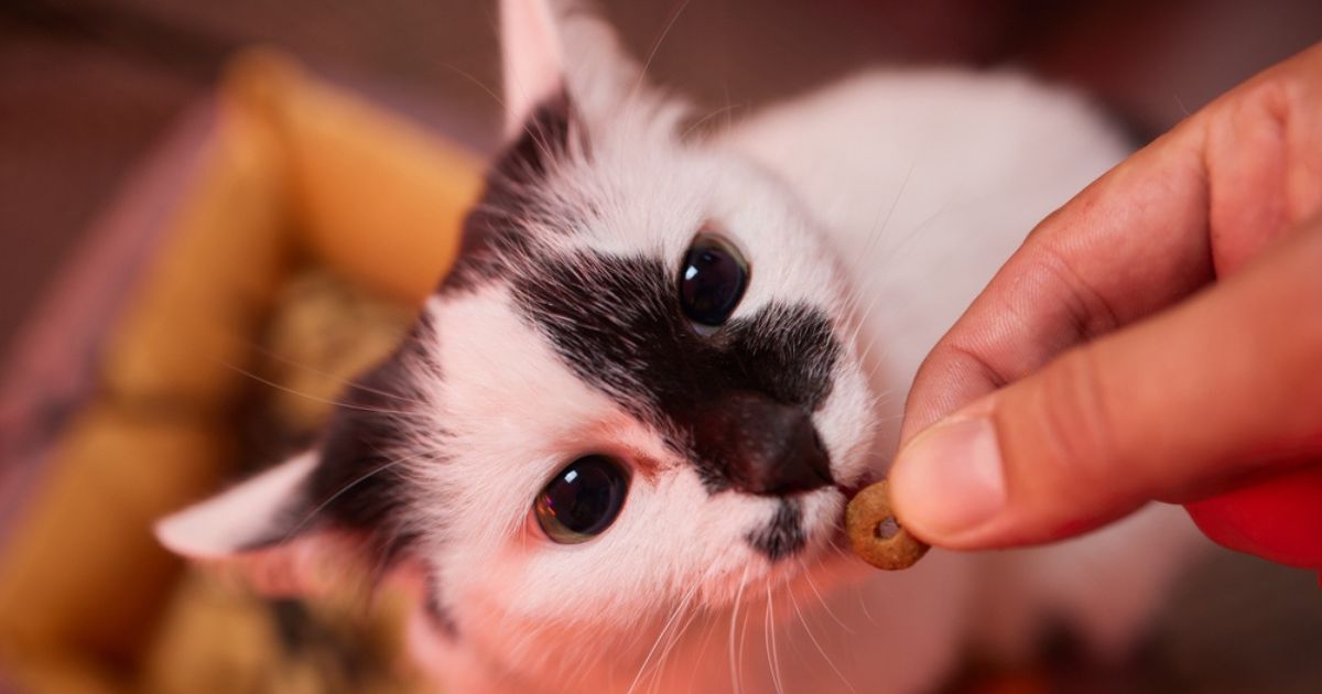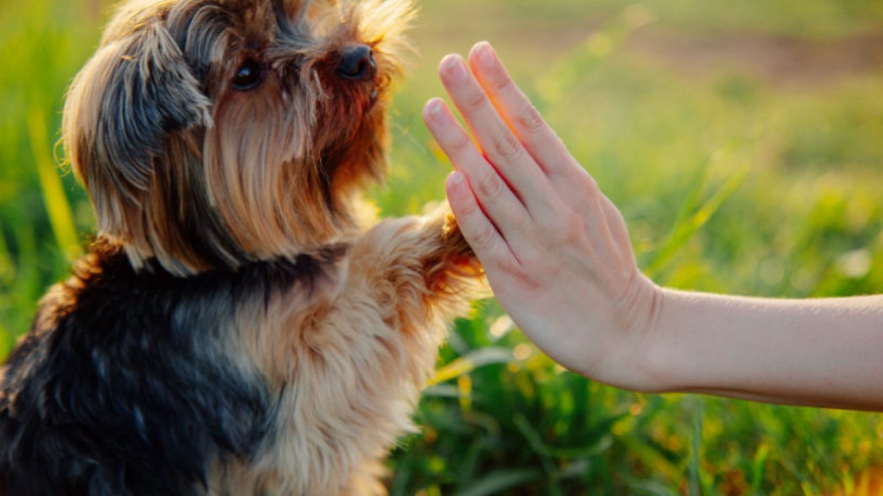 Seguramos um petisco na mão e deixamos o cachorro farejar e tentar pegá-lo.